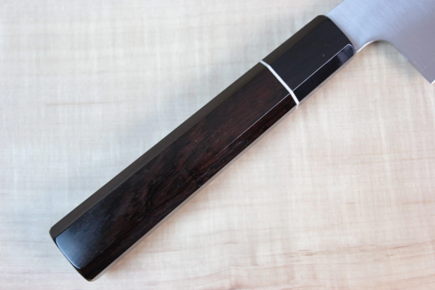 Sukenari HAP-40 knives are fitted with a beautiful octagonal Ebony wood handle, which has a buffalo horn ferrule and White Spacer. A Magnolia wood Saya (Sheath) is also included with the knife for safekeeping