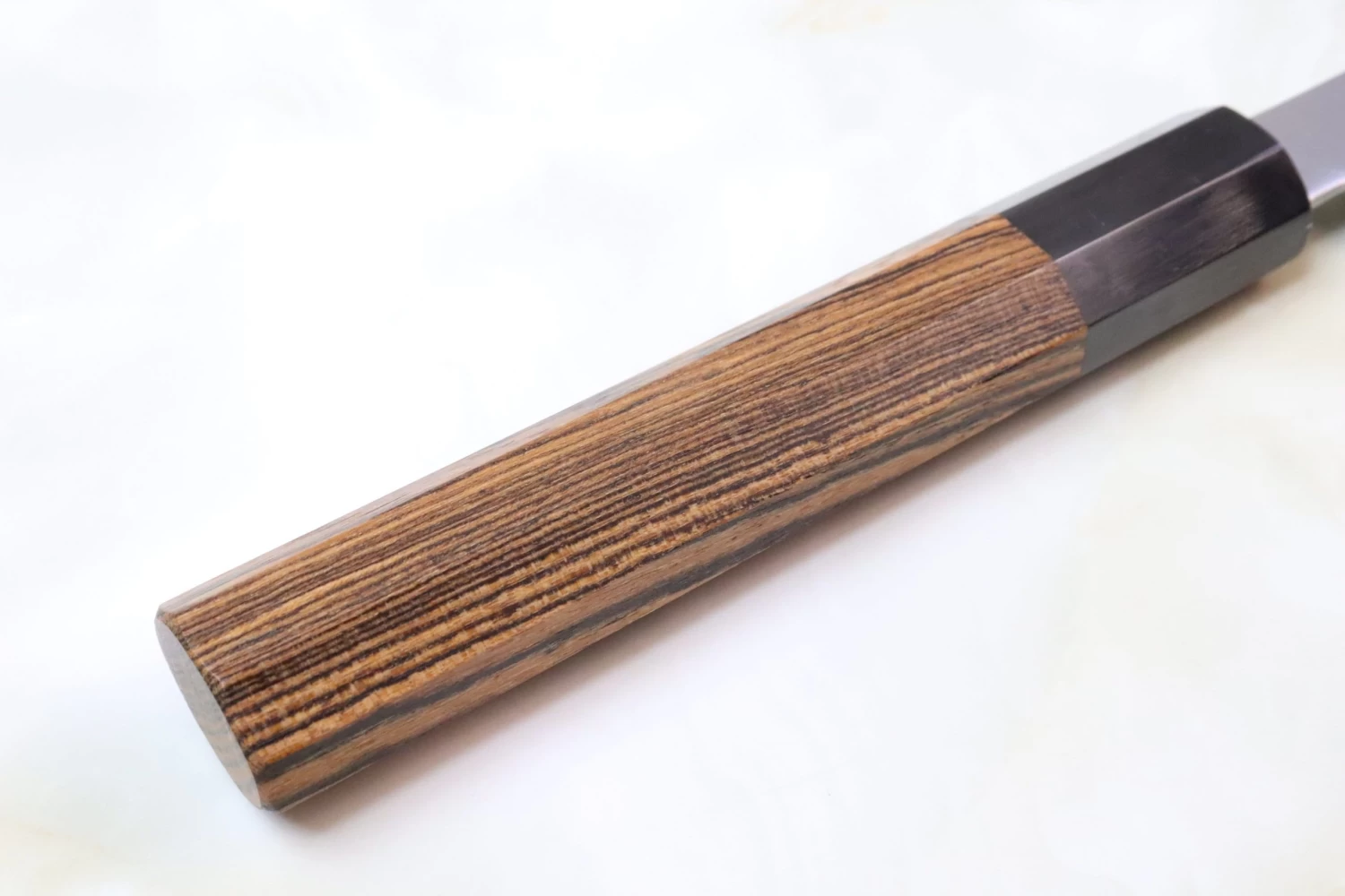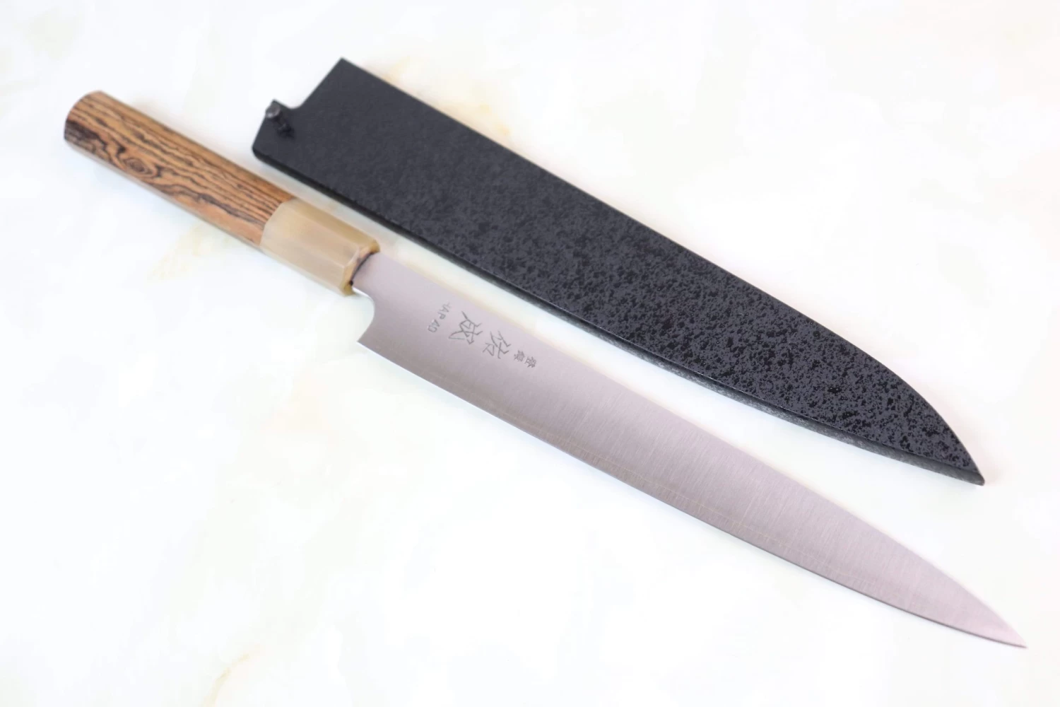 Sukenari HAP-40 knives are fitted with a unique natural wooden texture of octagonal Bocote wood handle, which has a buffalo horn ferrule. For safekeeping, this knife comes with a matching Black Lacquered Wooden Saya (Sheath) with a black pakkawood Saya pin.