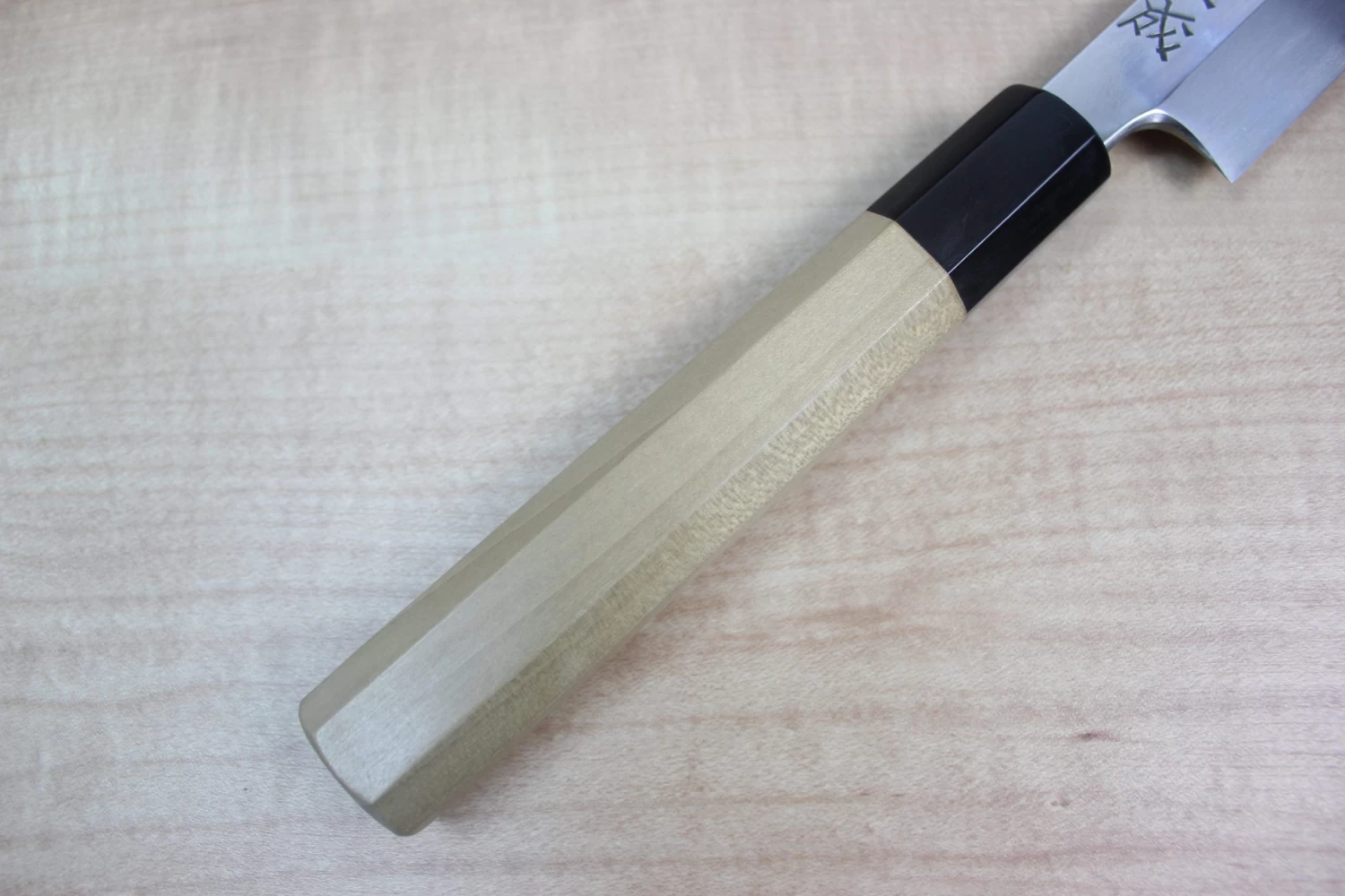 Sukenari VG-10 Hon Kasumi series knife is fitted with select quality Octagon Shaped magnolia wood handles that have water buffalo horn ferrules / collars. They are very comfortable and provide a secure grip.