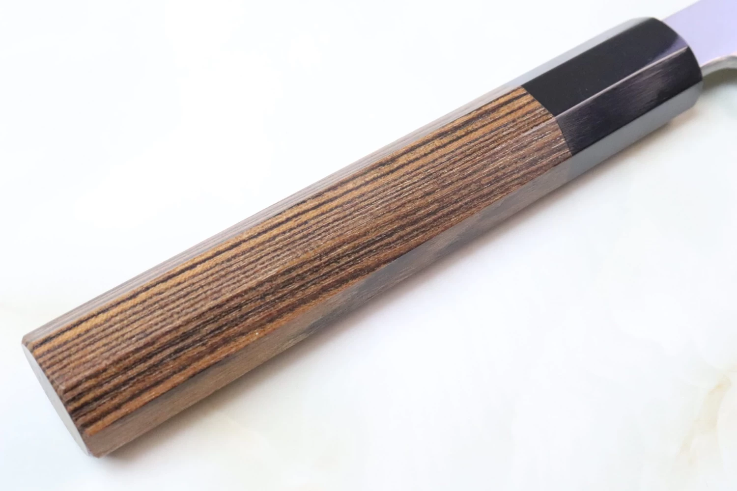 Sukenari VG-10 Hon Kasumi series knife is fitted with a unique natural wooden texture of octagonal Bocote wood handle, which has a buffalo horn ferrule. For safekeeping, this knife comes with a matching Black Lacquered wood Saya (Sheath) with a black pakkawood Saya pin.They are very comfortable and provide a secure grip.