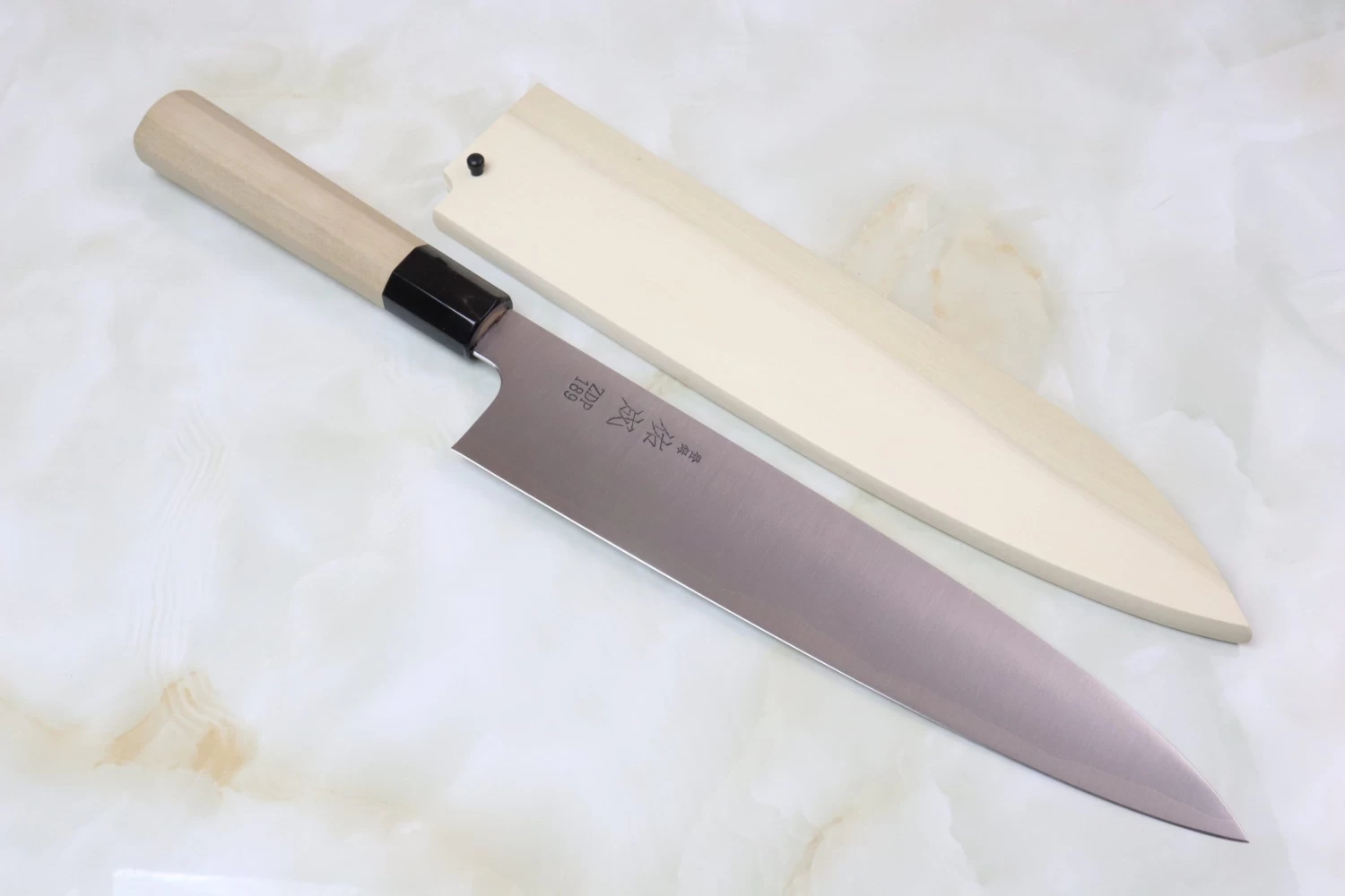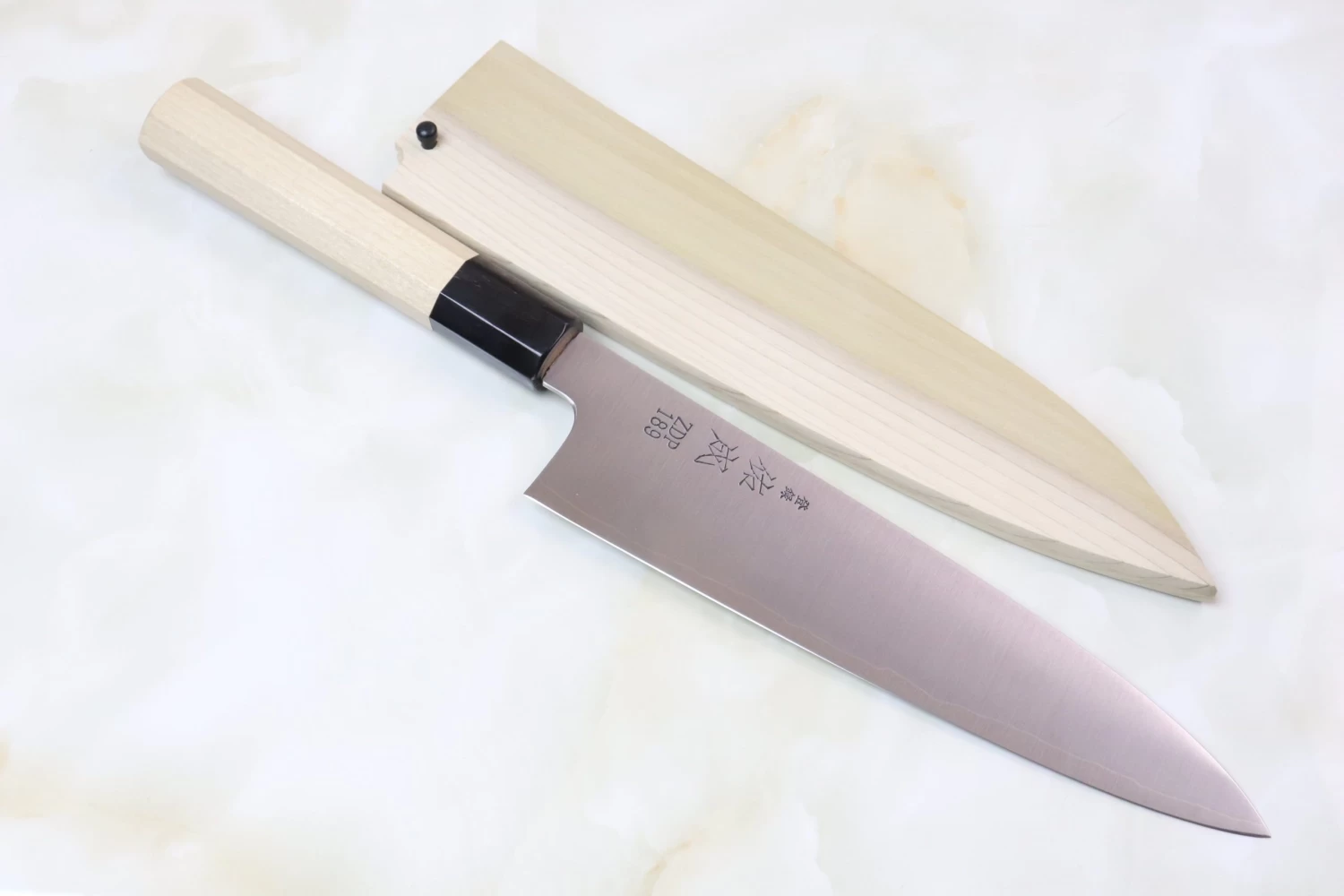 This knife has a octagonal Magnolia wood handle, which has a buffalo horn ferrule. For safekeeping, this knife comes with a matching Handcrafted Magnolia wood Saya (Sheath) with a black pakkawood Saya pin.