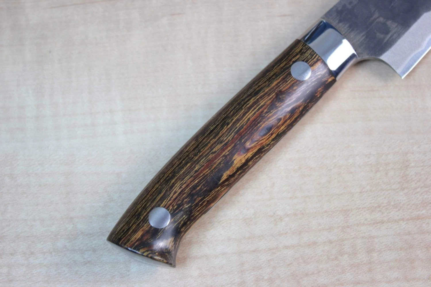 The “Aogami Super Black Forged Knife” has a blade core of Aogami Super that is sandwiched between two layers of corrosion-resistant soft stainless steel. The laminated blade is decorated with a Tsuchime (“Hammered pattern”) texture and a traditional Japanese Kurouchi (“Literally, “Black-forged”) finish that ads a touch of rustic style. This knife is available with Ironwood’ handle scales that have a rich warm color and dramatic figuring.