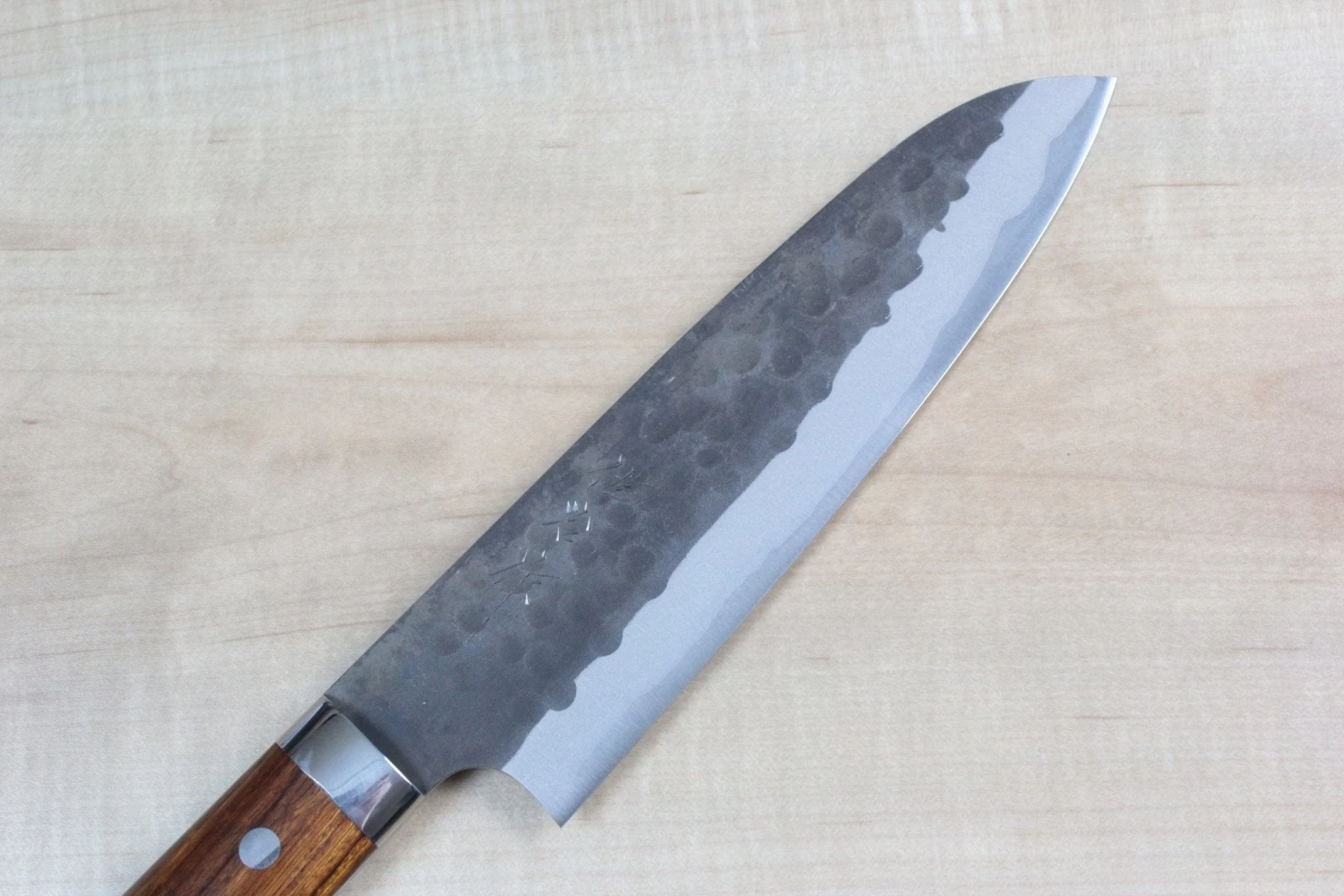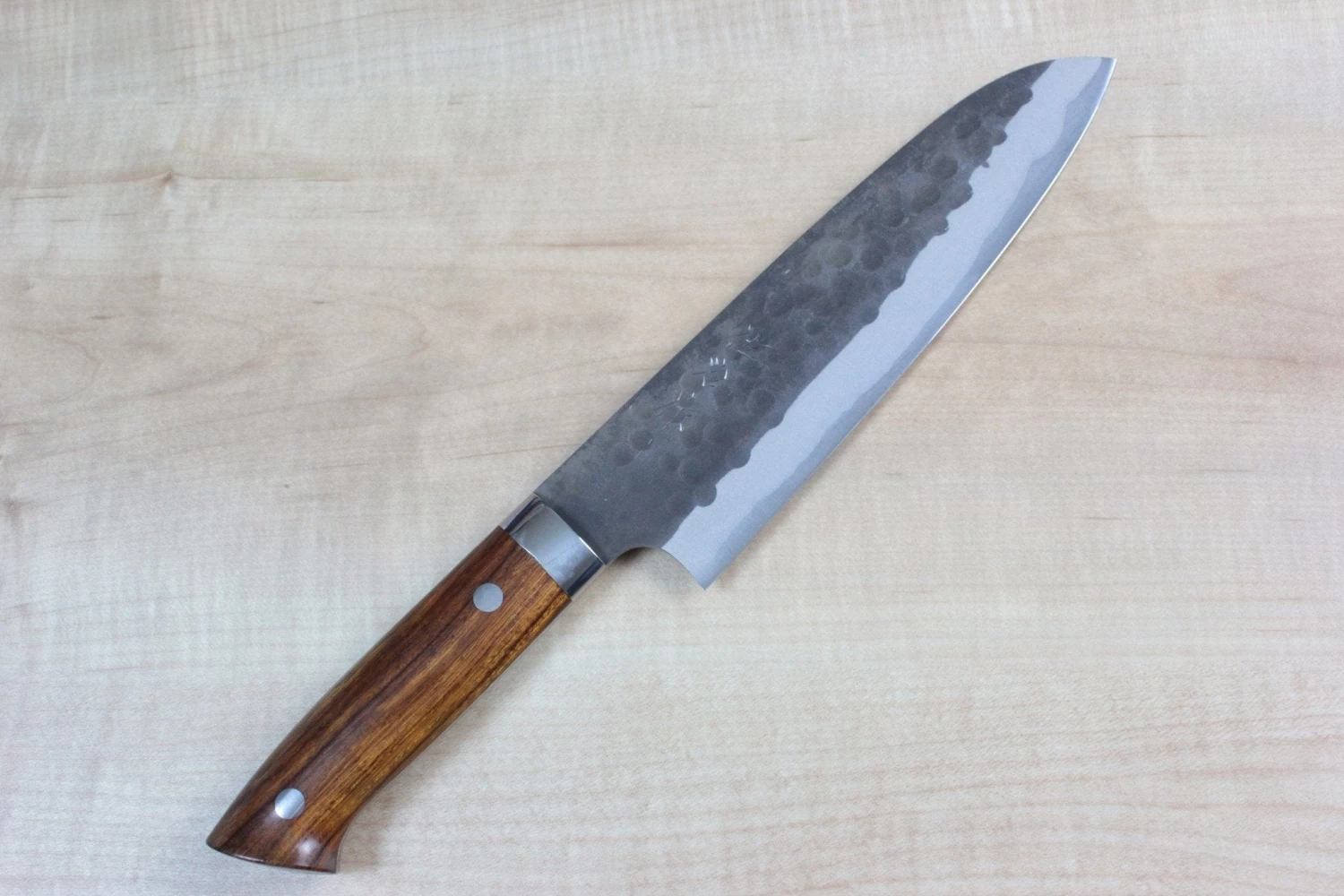 The “Aogami Super Black Forged Knife” has a blade core of Aogami Super that is sandwiched between two layers of corrosion-resistant soft stainless steel. The laminated blade is decorated with a Tsuchime (“Hammered pattern”) texture and a traditional Japanese Kurouchi (“Literally, “Black-forged”) finish that ads a touch of rustic style. This knife is available with Ironwood’ handle scales that have a rich warm color and dramatic figuring.