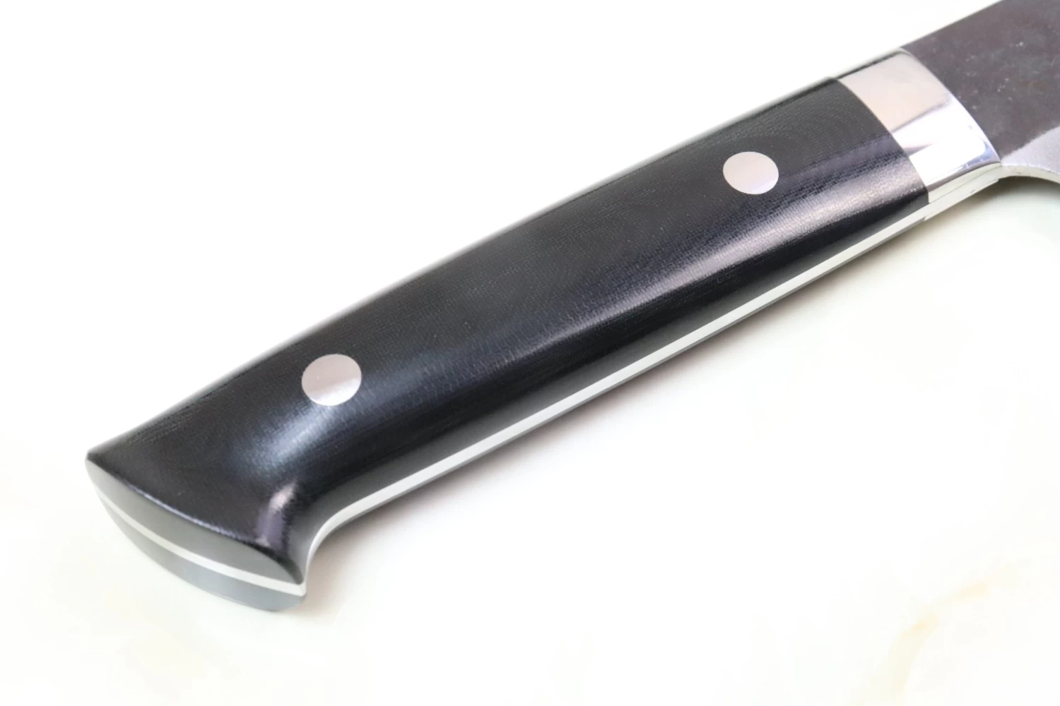 The “Aogami Super Black Forged Knife” has a blade core of Aogami Super that is sandwiched between two layers of corrosion-resistant soft stainless steel. The laminated blade is decorated with a Tsuchime (“Hammered pattern”) texture and a traditional Japanese Kurouchi (“Literally, “Black-forged”) finish that ads a touch of rustic style. This knife is available with black linen Micarta® handle scales that beautifully match the black and grey tones of the Kurouchi finish or ‘Linen Micarta® is a very practical handle material for kitchen knife because it is very durable, resistant to both water and shrinkage and provides good traction even when it is wet. The handle is carefully contoured by hand to ensure that it can be gripped comfortably and are fitted with a stainless steel bolster for improved durability and blade balance.