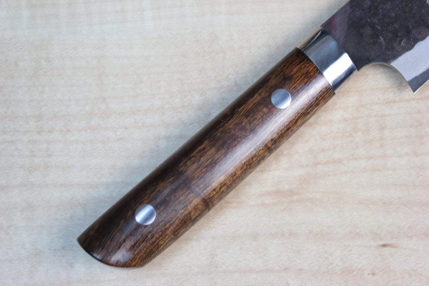 The “Aogami Super Black Forged Knife” has a blade core of Aogami Super that is sandwiched between two layers of corrosion-resistant soft stainless steel. The laminated blade is decorated with a Tsuchime (“Hammered pattern”) texture and a traditional Japanese Kurouchi (“Literally, “Black-forged”) finish that ads a touch of rustic style. This knife is available with Ironwood’ handle scales that have a rich warm color and dramatic figuring.