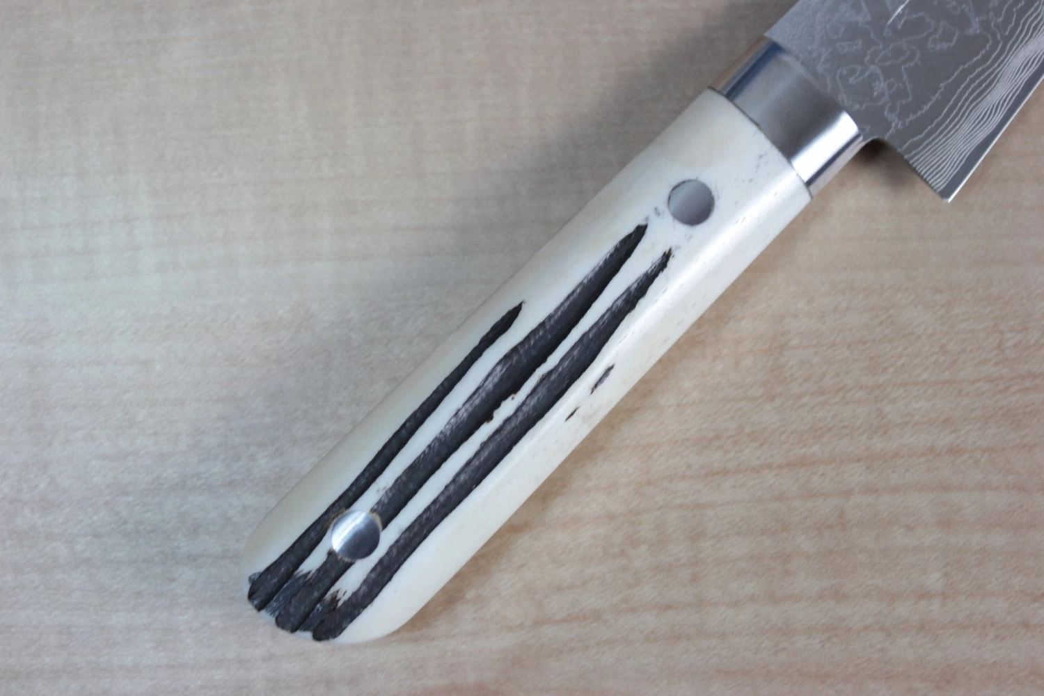 The polished R-2 Damascus blade has an uneven surface texture and has a style and appearance that is very different to the other Damascus blades, which are on the market. You can sense Master Saji’s vitality and powerful spirit is present inside the blade. This knife fitted with Stag Bone handle scales and polished stainless steel bolster and rivets, which match the energetic style of the Damascus blade.