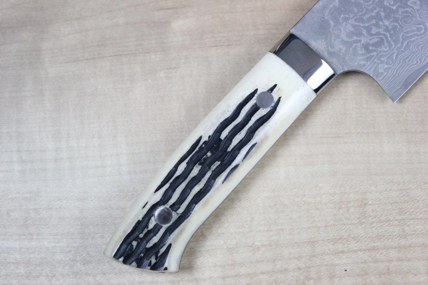 A dark R-2 Damascus blade, which features a crisp and vigorous Damascus pattern. This knife fitted with Stag Bone handle scales and polished stainless steel bolster and rivets, which match the energetic style of the Damascus blade.