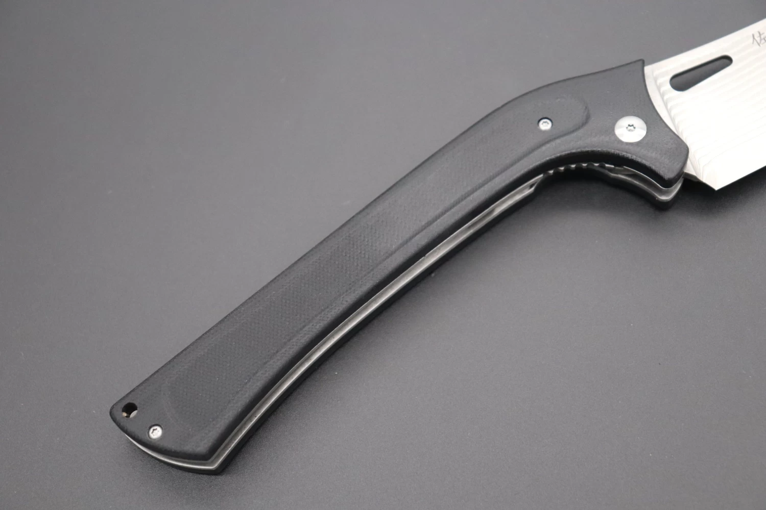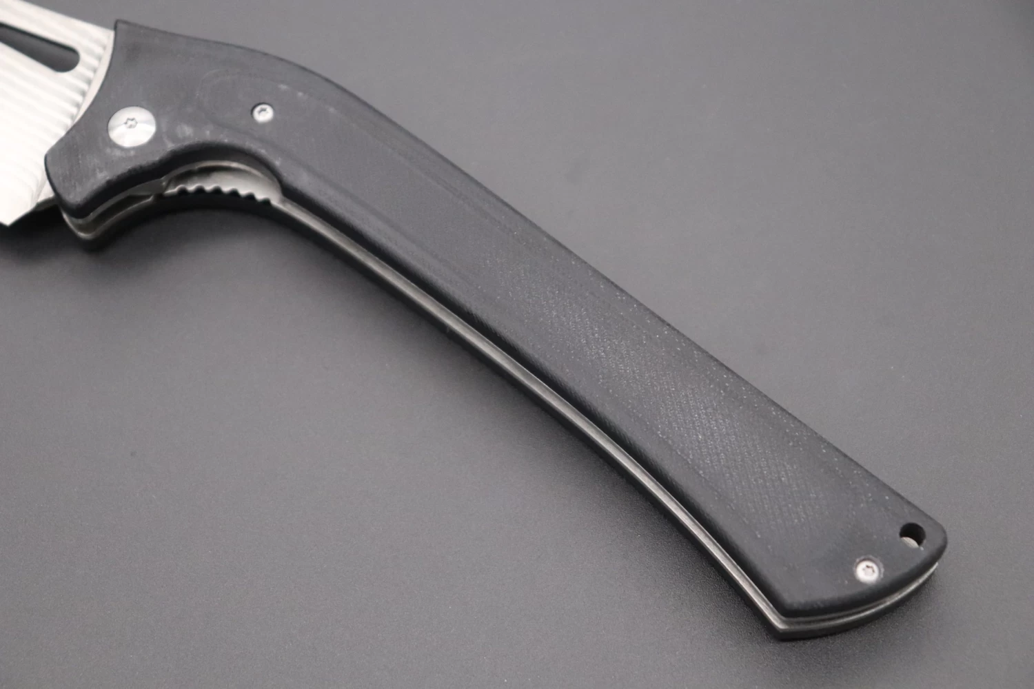 The Black G-10 handle is 6-1/4″ (158mm) long, is hand contoured for maximum comfort and features a lanyard hole. The curved design helps to keep your hands away from the cutting board.