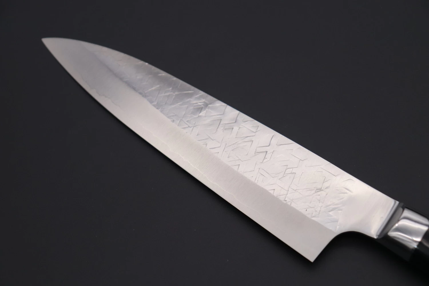 To compliment this unusual blade steel, Master Saji decided to sandwich the mirror polished SRS-13 blade core between layers of soft stainless steel and decorate them with a unique Tsuchime hammered texture.