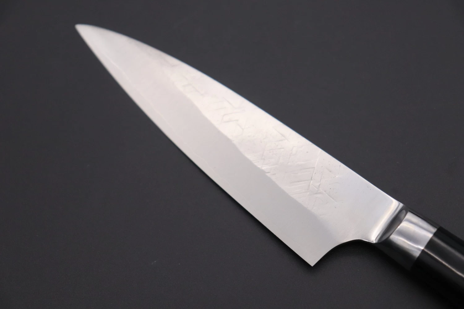 To compliment this unusual blade steel, Master Saji decided to sandwich the mirror polished SRS-13 blade core between layers of soft stainless steel and decorate them with a unique Tsuchime hammered texture.