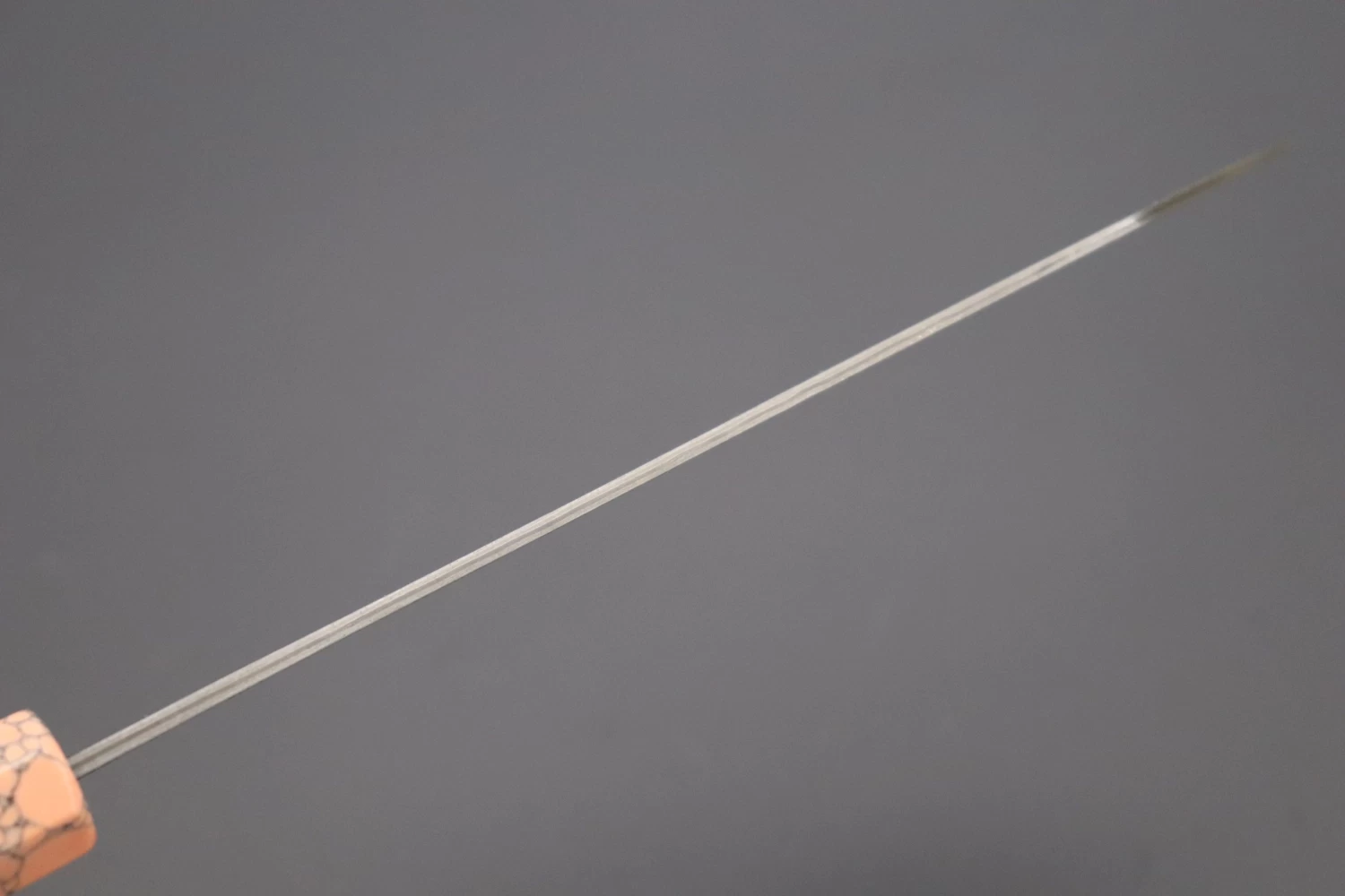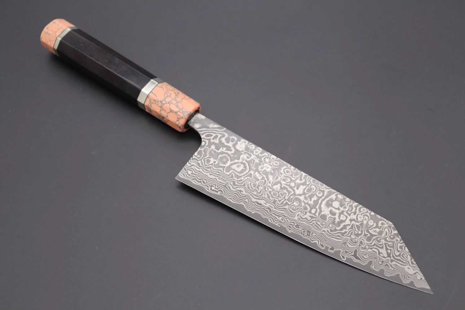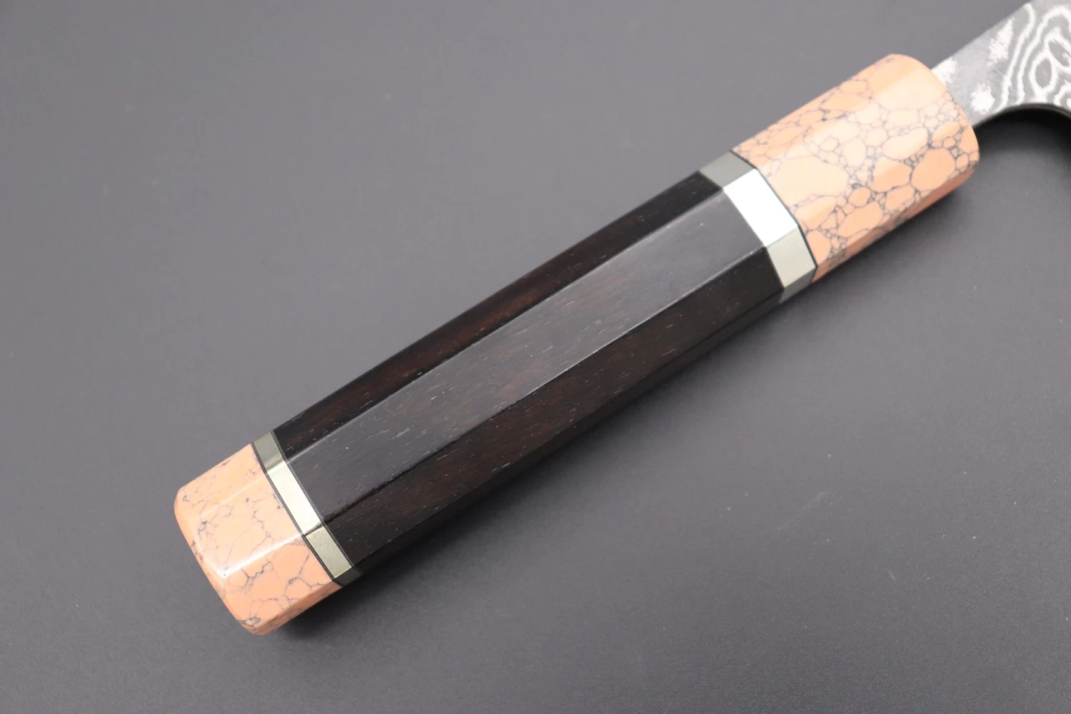 This Custom Limited Edition Takeshi Saji R-2 Damascus Bunka Knife with Contemporary, Stylish Wa Handle. The Innovative Octagonal Ebonywood handle with Soft Pink Turquoise Composite Stone Ferrule & Butt with Nickel Silver Spacers.