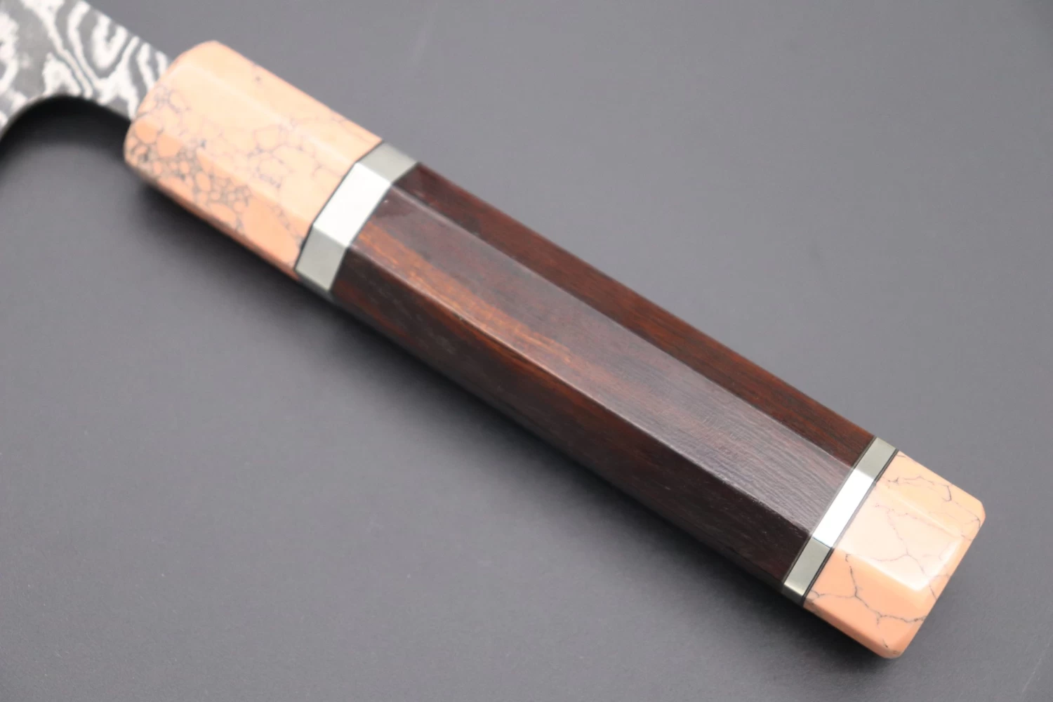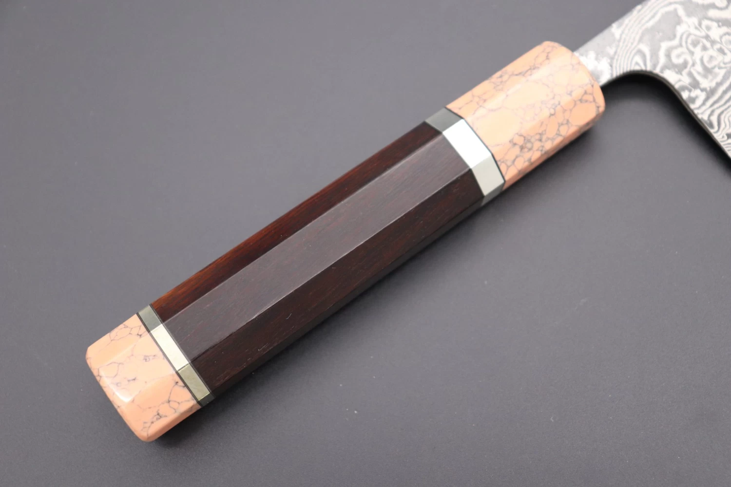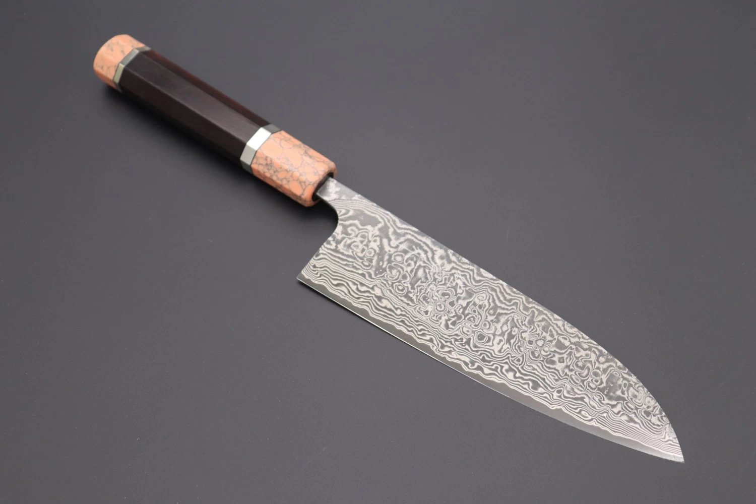 This Custom Limited Edition Takeshi Saji R-2 Damascus Wa Santoku Knife with Contemporary, Stylish Wa Handle. The Innovative Octagonal Desert Ironwood handle with a Soft Pink Turquoise Gem-Composite Stone Ferrule & Butt with Nickel Silver Spacers.