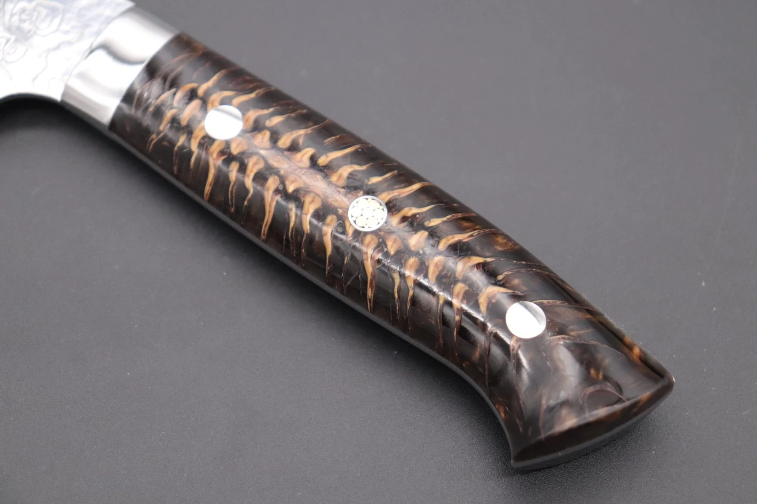 Mirror Polished R-2 Damascus blade, which features unique ‘random Damascus’ pattern, which Master Saji calls “Diamond Damascus”. It is handcrafted using a complex series of forging processes and undergoes a specially formulated acid etching and polishing process. When combined, these techniques produce a unique Damascus blade, which has an uneven surface texture that sparkles beautifully, like a cluster of cut diamonds.