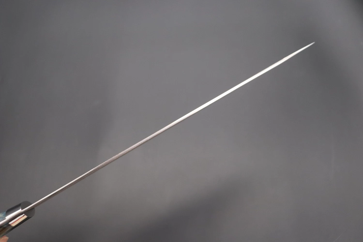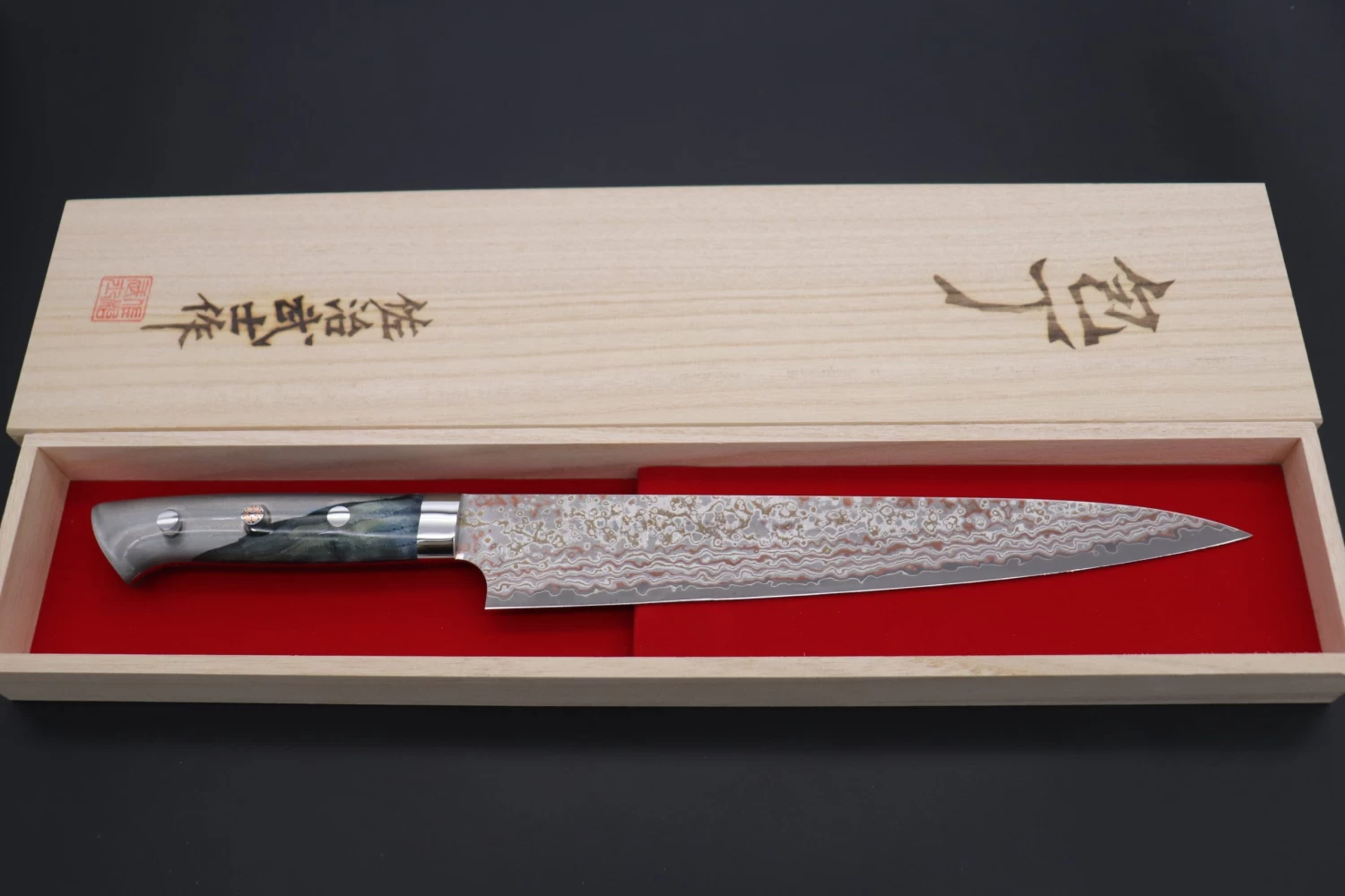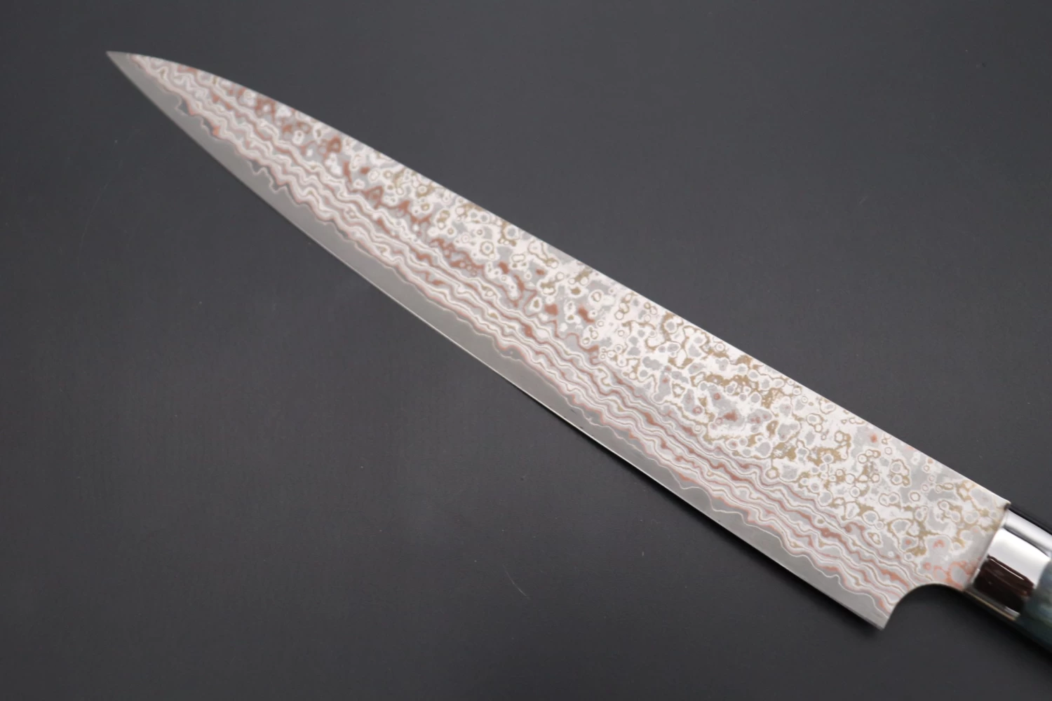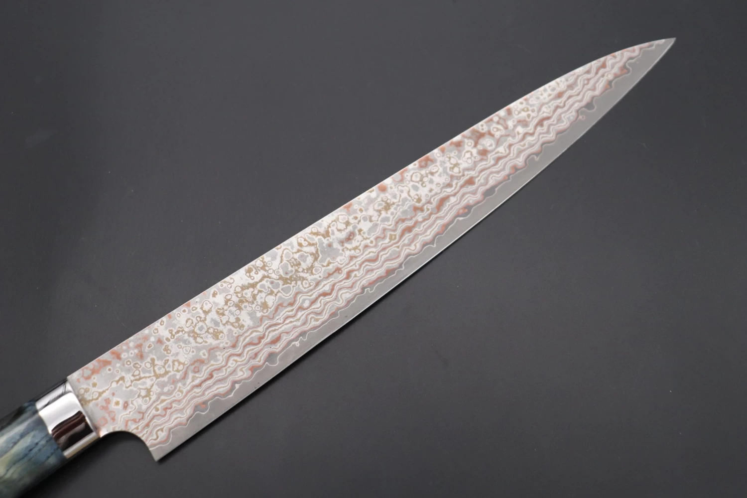 Knife Model: Takeshi Saji SUMMIT ― Limited Edition Custom Series SMT-757 VG-10W Multi-Colored Golden-Rainbow Damascus Series Sujihiki 240mm