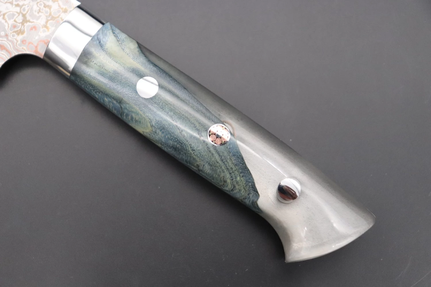 Master Saji has just completed a fresh new batch of traditional hammer forged custom kitchen knives that, once again, feature his unique multi-colored Damascus. The blades have a core of VG-10W Cobalt-Tungsten Stainless steel (HR.c 61 to 62), which has been clad with multiple layers of rust-resistant stainless steel, brass and copper.