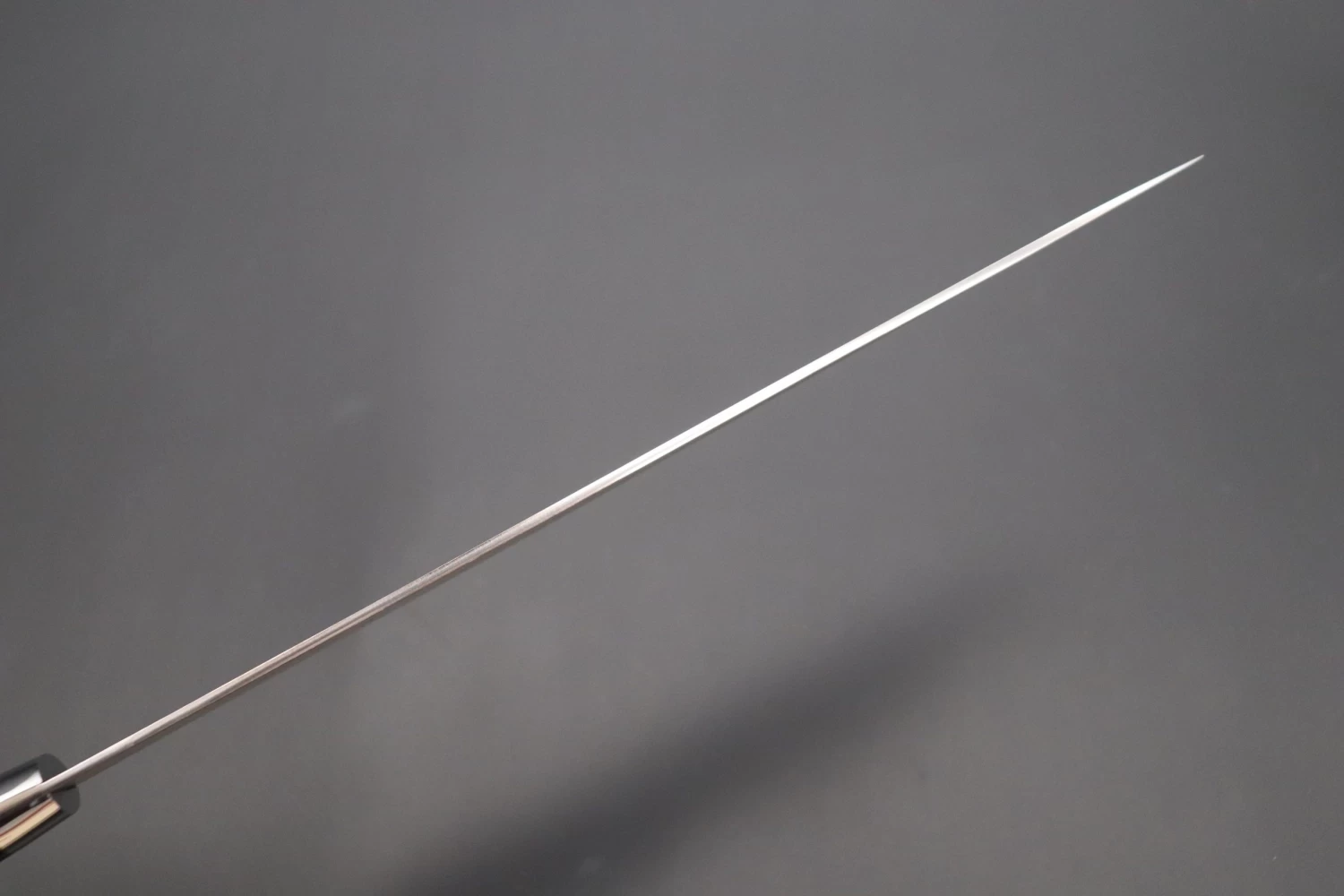 The long, narrow, graceful blade of the Sujihiki is particularly useful for trimming away sinew and fat from meat, finely slicing meat or boneless fish, or for filleting and skinning fish. The long blade allows the meat or fish to be cut in one single drawing motion, from heel to tip.