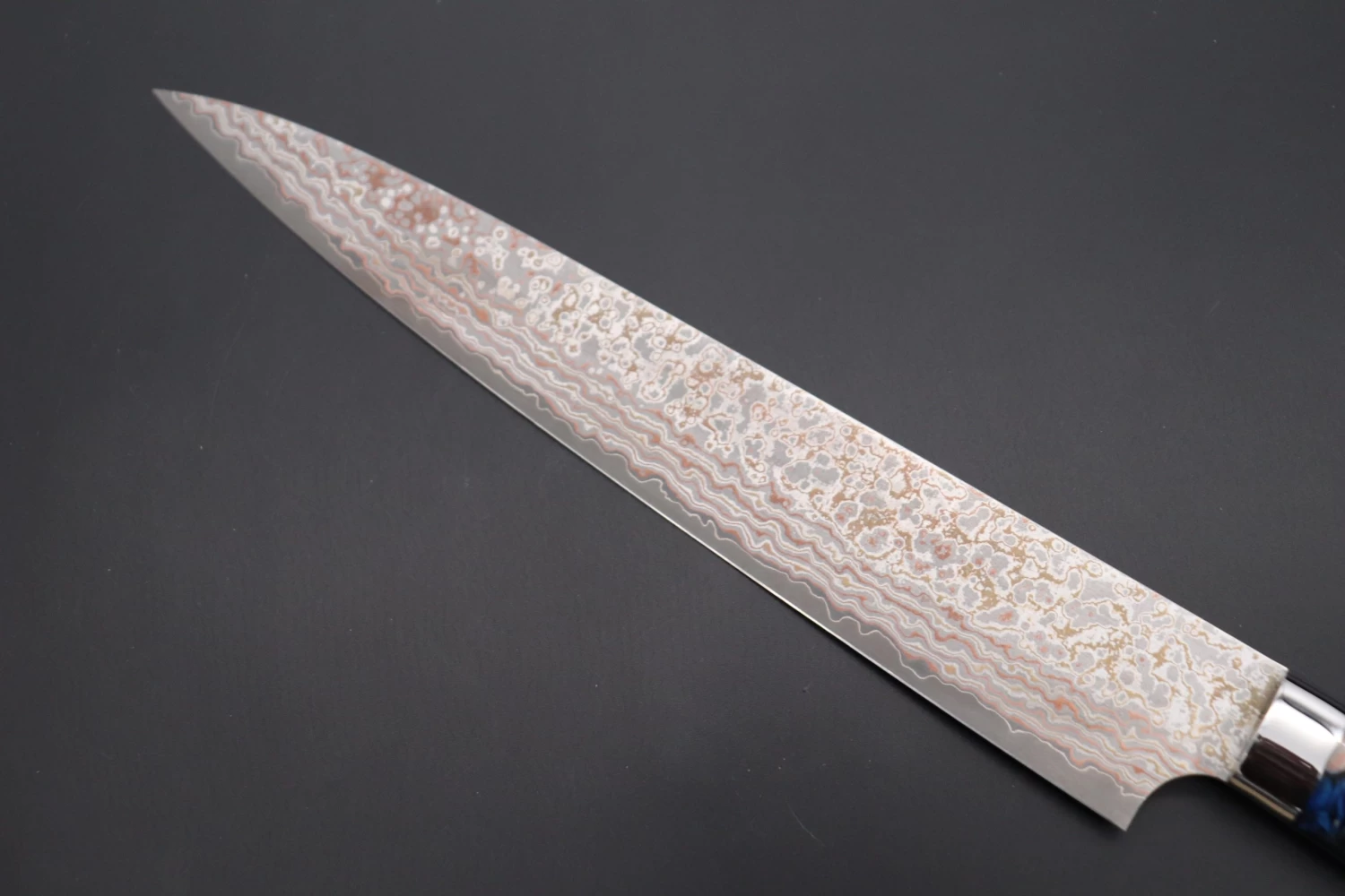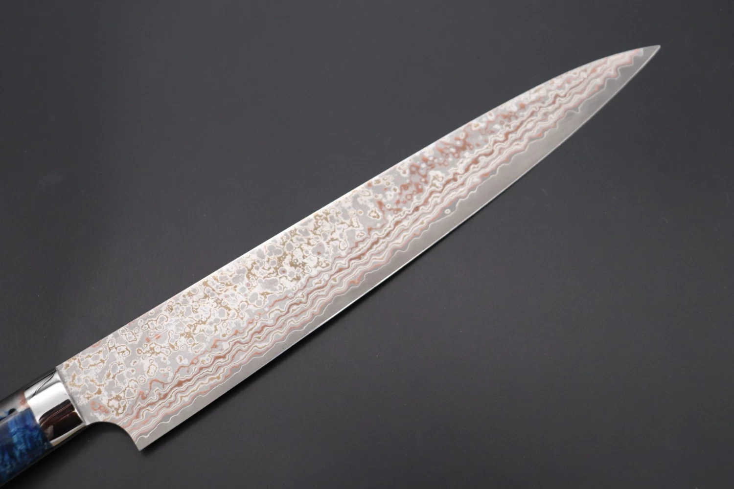 Knife Model: Takeshi Saji SUMMIT ― Limited Edition Custom Series SMT-758 VG-10W Multi-Colored Golden-Rainbow Damascus Series Sujihiki 240mm