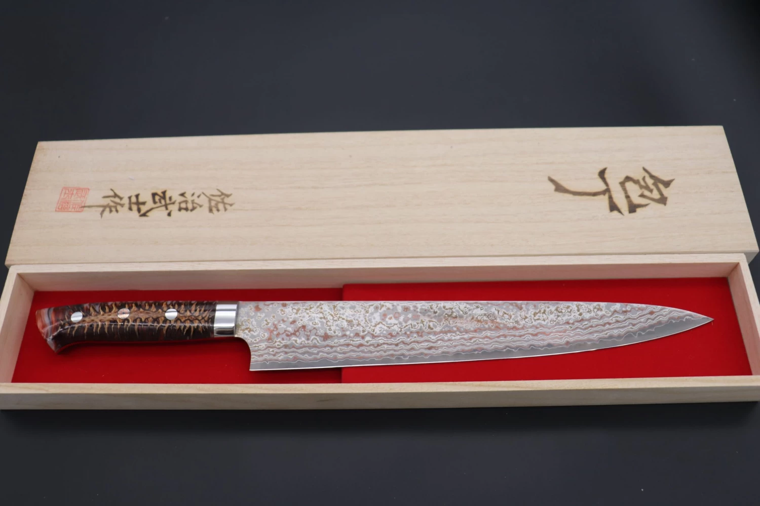 Each knife comes with a traditional Wooden Presentation Box that is inscribed with Takeshi Saji’s name.