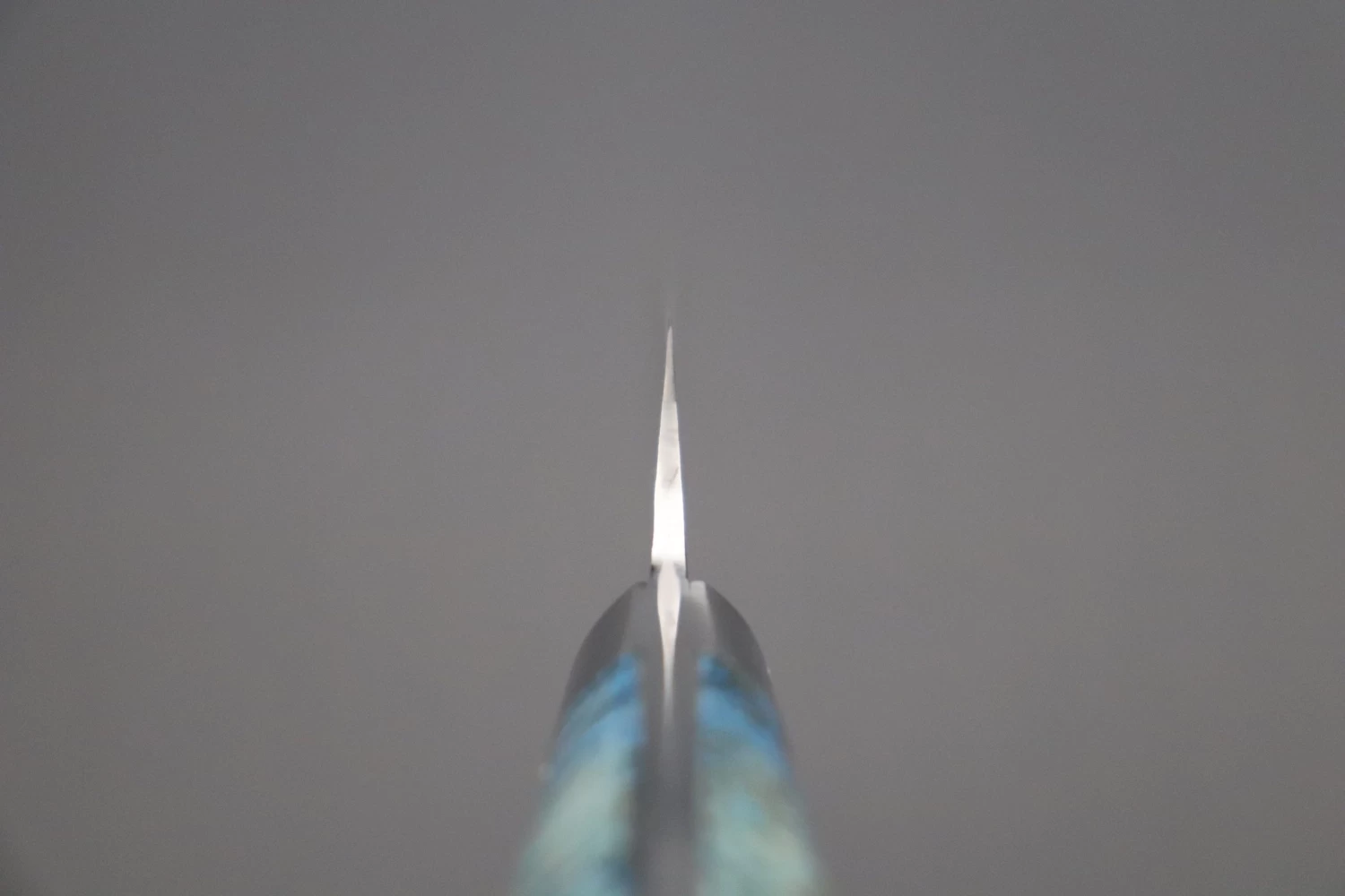 One day at the US Knife Show, we accidentaly met with this beautiful and rare, Transparent Super Silver Color, Stabilized Ocean Blue Color Hybrid Wood Material. We promptly requested Master Saji to use this special wood for his very limited edition knife and now another masterpiece of Saji SUMMIT- Limited Edition Custom Series knife is available.