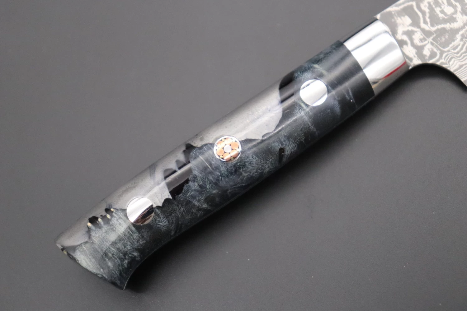 Handle Material: Transparent Super Silver Color, Stabilized Grey Color Hybrid Wood Handle with Stainless Steel Bolster