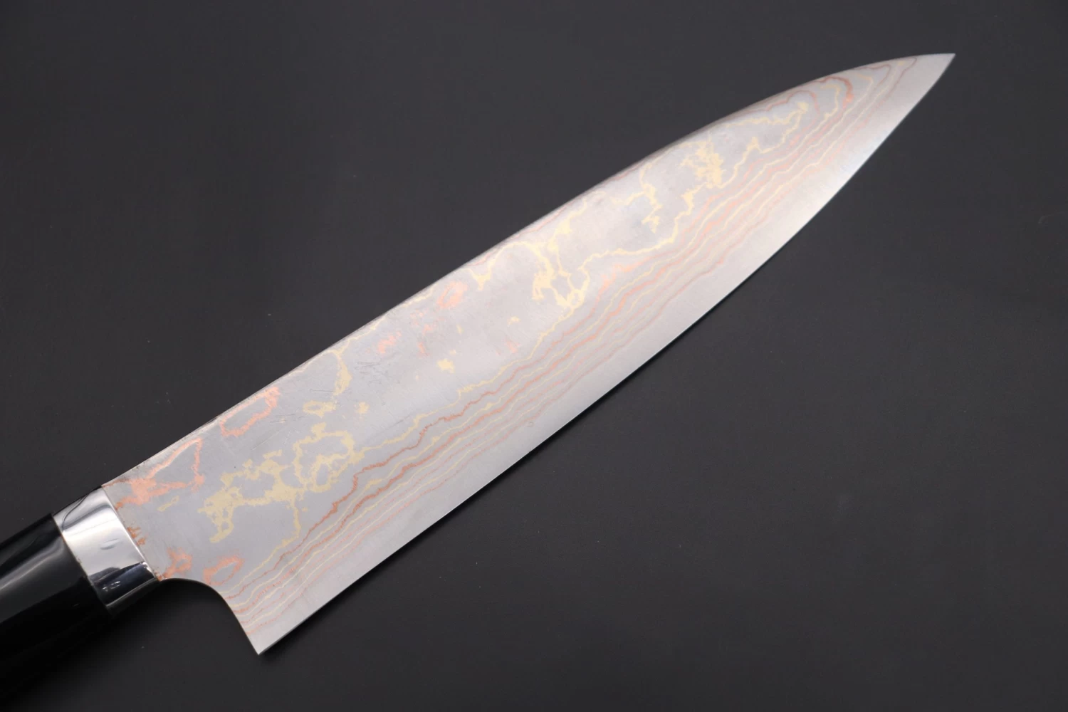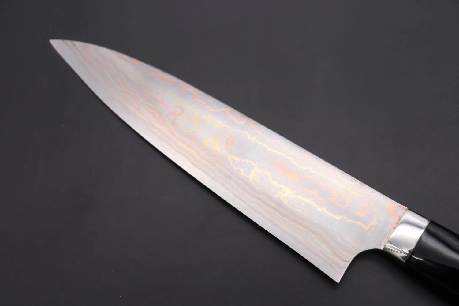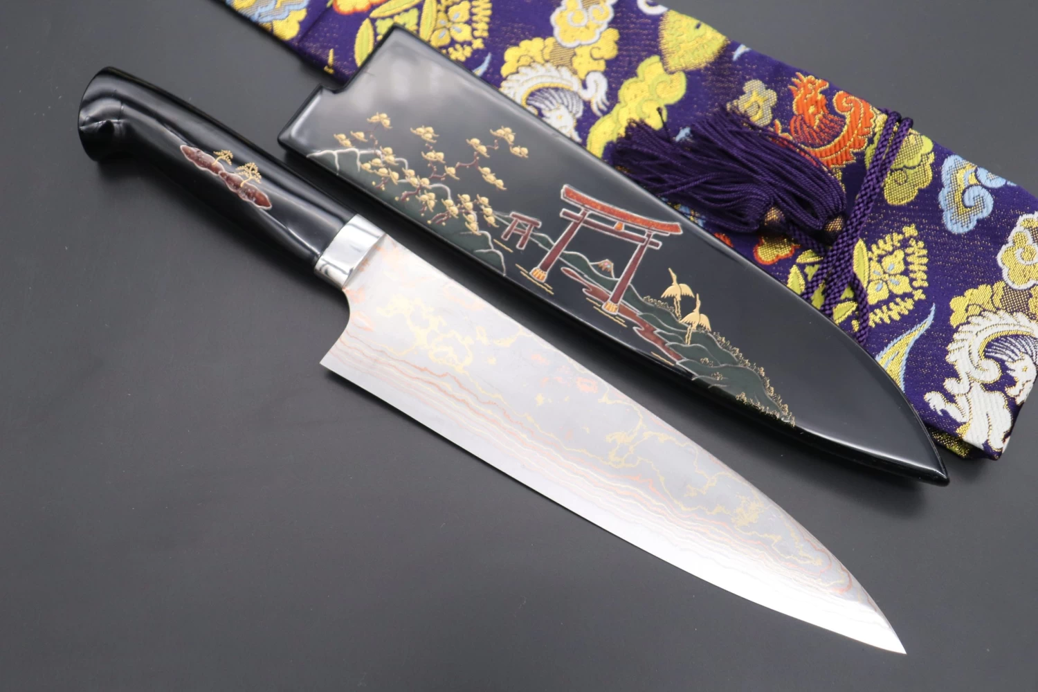 In order to match the decorative Maki-e artwork, Master forge-smith Takeshi Saji created some his unique multi-colored Damascus steel blade, which is made by forging a core of Blue #2 steel together with multiple layers of stainless steel, brass and copper. Each blade has a traditional Hamaguri-ba (convex) grind and a ‘hidden tang’ that is fitted with a stainless steel bolster and a black, Urushi lacquered handle.