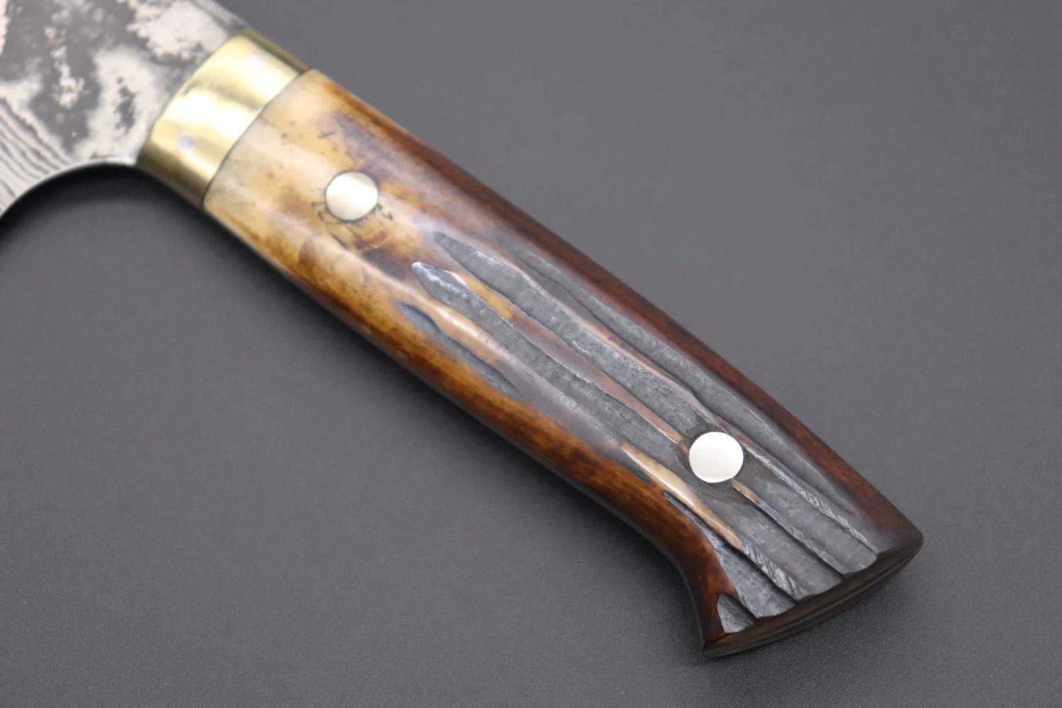 The layers of white-colored Nickel steel in this Damascus blade contrasts strongly with the stainless steel layers to produce a powerful wavy Damascus pattern that truly sparkles. To further accentuate the wild appearance of the Damascus, Master Saji decided to use natural Stag Bone to produce some very tasteful handle scales and a pinned brass bolster, which will age beautifully.