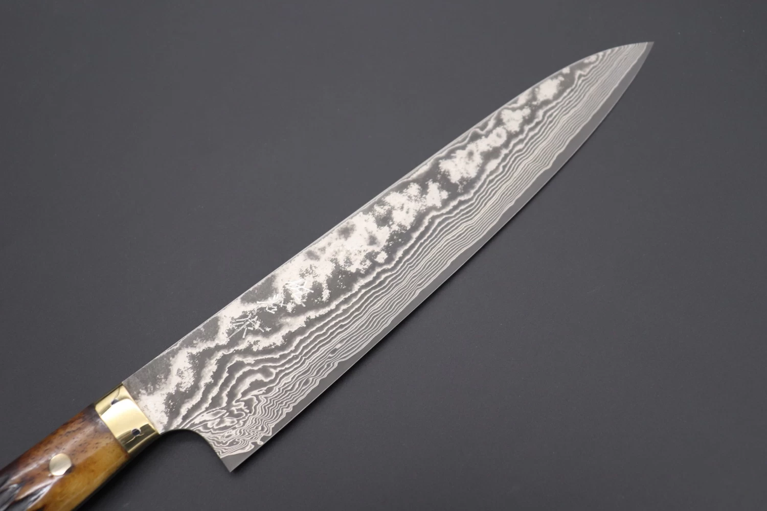 The layers of white-colored Nickel steel in this Damascus blade contrasts strongly with the stainless steel layers to produce a powerful wavy Damascus pattern that truly sparkles. To further accentuate the wild appearance of the Damascus, Master Saji decided to use natural Stag Bone to produce some very tasteful handle scales and a pinned brass bolster, which will age beautifully.