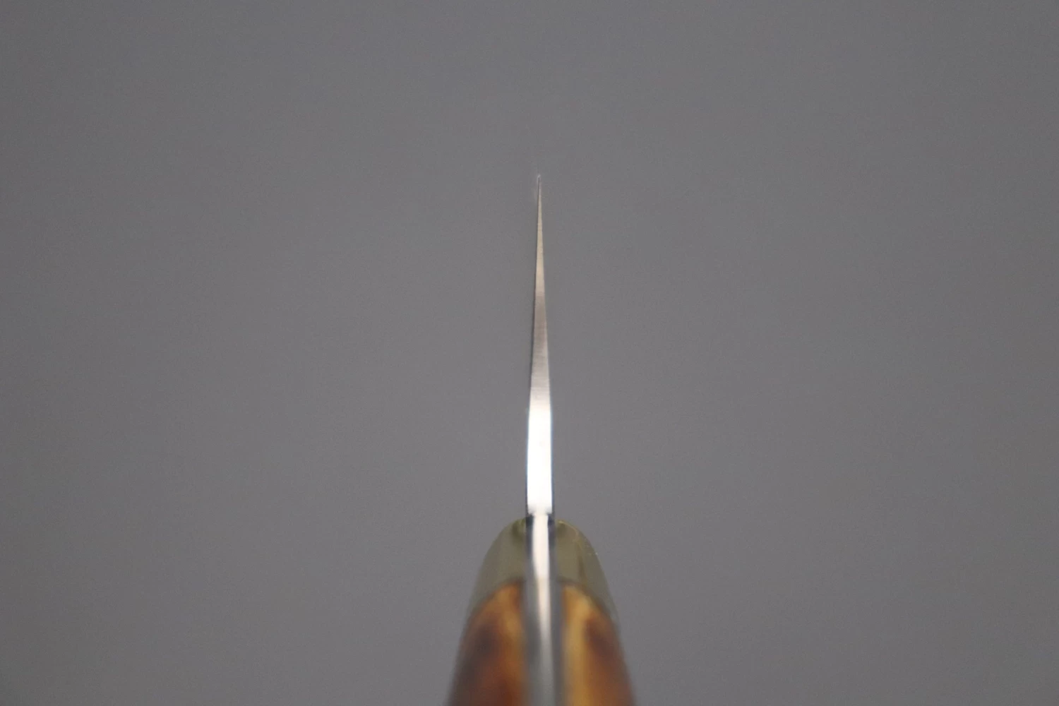 The tall blade and rounded nose / tip of the Santoku make it a versatile knife that is well suited to cutting meat, fish, or vegetables; Hence it’s name, which literally means “Three-purpose”. The Santoku is often recommended as a multi-purpose kitchen knife.